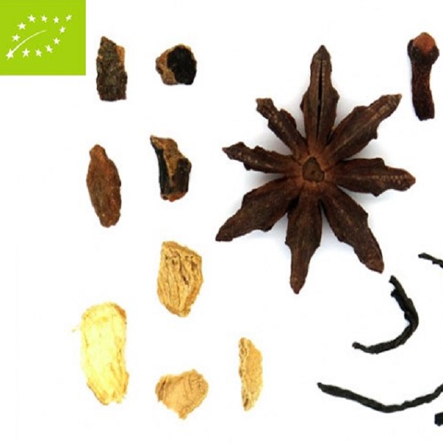 Τσάι Μαύρο, κανέλα, χαρούπι, πιπερόριζα, αστεροειδής γλυκάνισος, γαρύφαλλο, μοσχοκάρυδο, φυσικό άρωμα κανέλας, φυσικό άρωμα αμυγδαλο-μπαχαρικών. – Βιολογικής Καλλιέργειας.