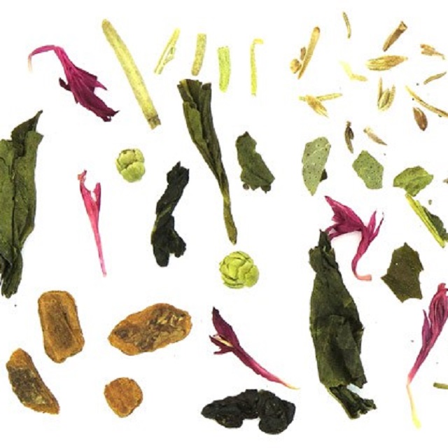 Πράσινο τσάι, δυόσμος, κανέλα, δενδρολίβανο, φύλλα βασιλικού, ρίγανη, άρωμα περγαμόντου, φασκόμηλο, πέταλα κυάνου.