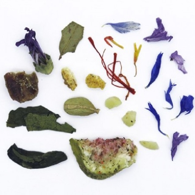 Πράσινο τσάι, κομμάτια από χουρμάδες (χουρμάδες, ριζάλευρο, κομμάτια αμυγδάλου, φλούδα εσπεριδοειδών, σπόροι κάρδαμου, άρωμα, φέτες σύκου, καρπός πράσινο κάρδαμου, πέταλα καρθάμου, πέταλα κυάνου, πέταλα μολόχας, σαφράν.