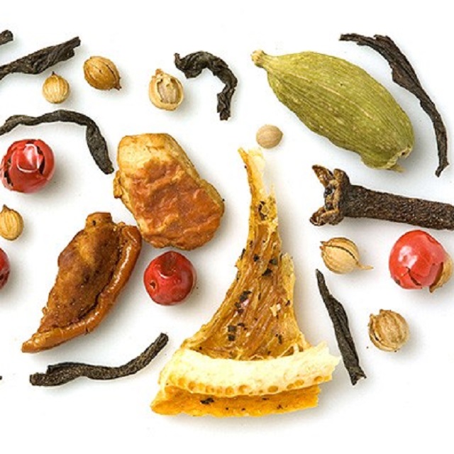 Μαύρο τσάι, κομμάτια μήλου, κομμάτια κανέλας, κορίανδρο, άρωμα, κάρδαμο, φέτες πορτοκαλιού, ροζ πιπέρι, γαρύφαλλο.