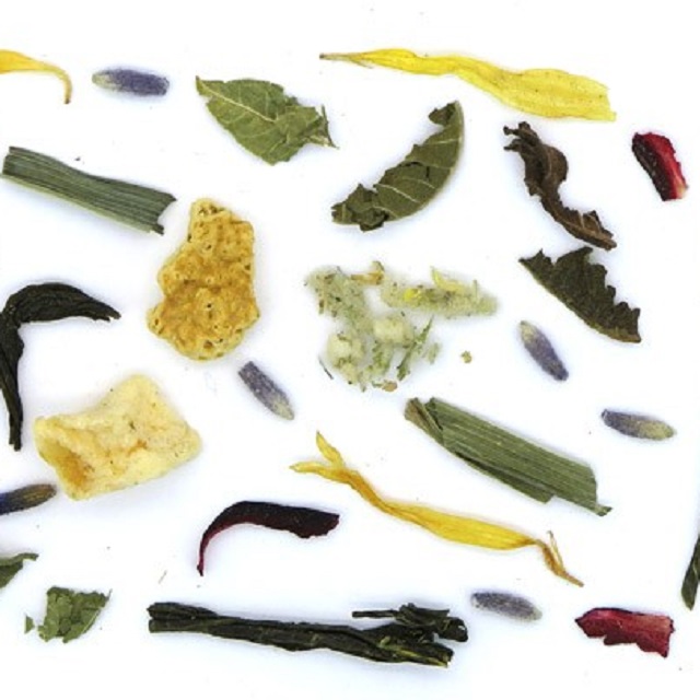 Πράσινο τσάι, λουίζα, άνθη λεβάντας, φλούδα εσπεριδοειδών, λεμονόχορτο, κομμάτια μήλου, άνθη ιβίσκου, μυρτιά, τσάι του βουνού, ρίγανη, πέταλα καλέντουλας, φυσικό άρωμα λεβάντας.